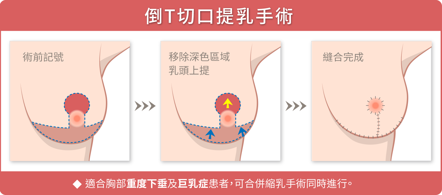 沿著乳暈周圍至乳房下圍,製造一個倒T型切口,切除多餘皮膚和下垂的乳房組織,並將乳頭提高至適合位置。